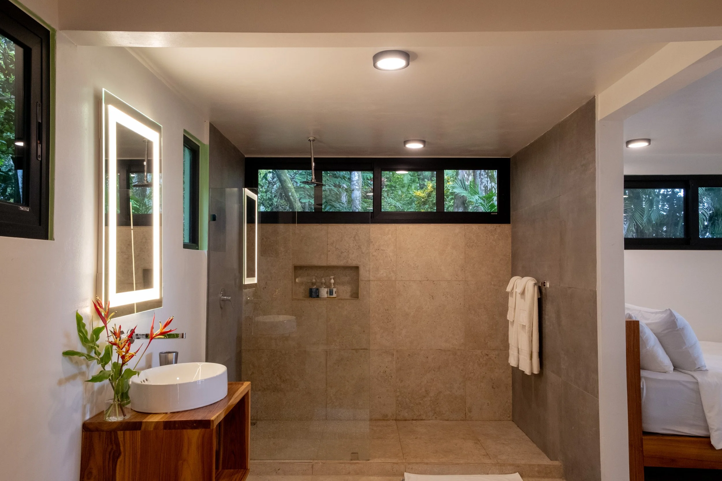 Casa Tucán was designed for indoor–outdoor living, with spaces that open toward ocean views and Jungle Gardens.